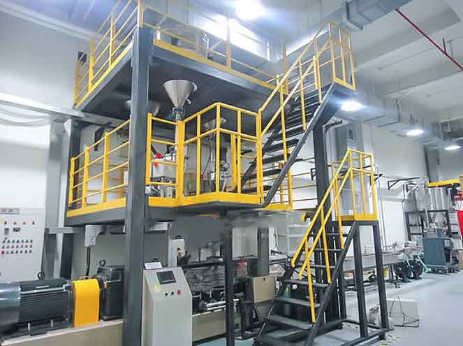 上階機(jī)為JWP系列平行同向雙螺桿混煉機(jī)。利用雙螺桿的高速、高剪切、強(qiáng)混合優(yōu)勢(shì),使物料充分完成塑化混合,由于無機(jī)頭背壓,使得我們針對(duì)不同物料靈活的排列螺桿組合,達(dá)到物料混合較好狀態(tài)。